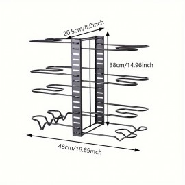 A contemporary kitchen ceiling rack with 12 hooks for hanging pots and pans, finished in black, designed for modern storage solutions.